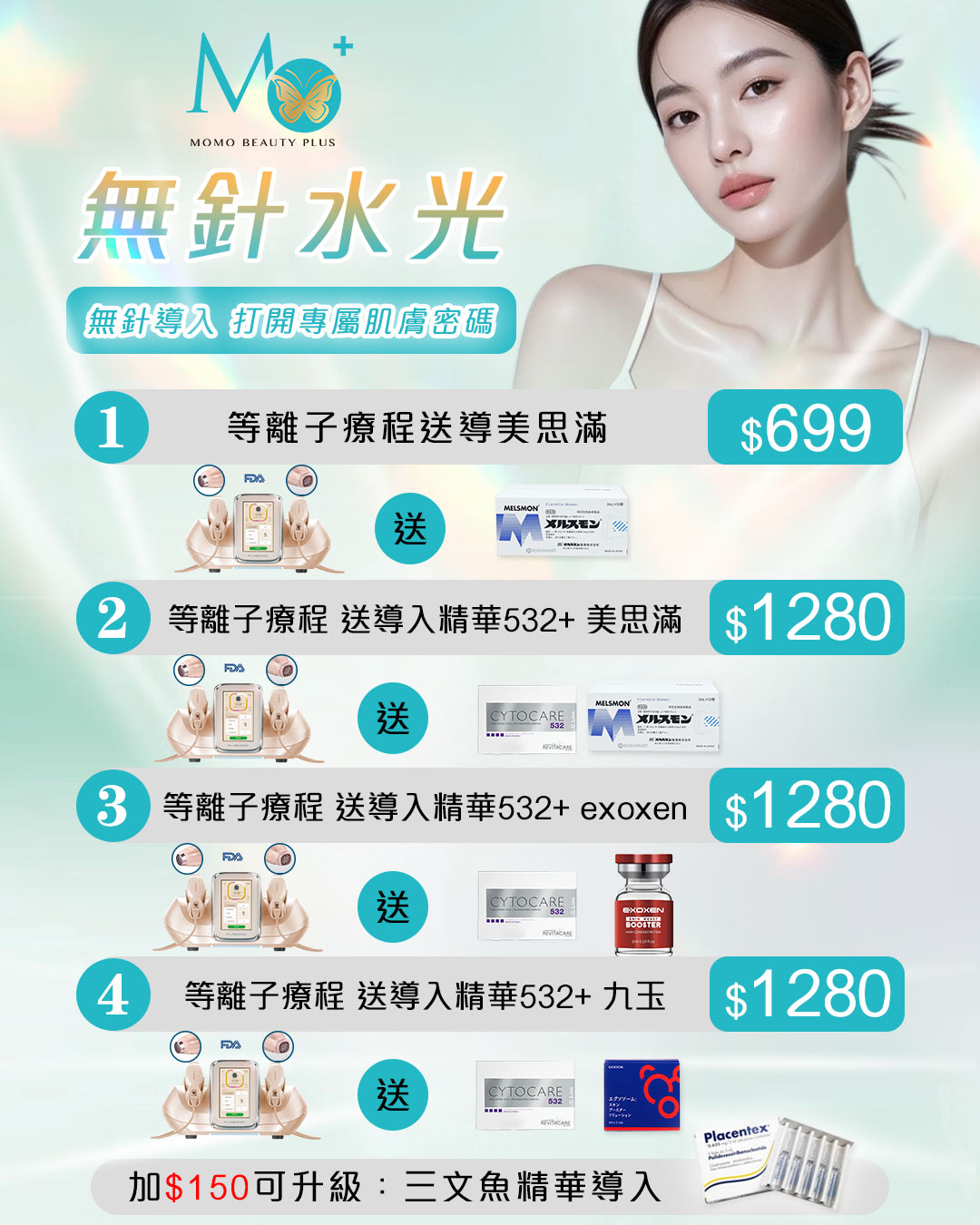 ·全系列無針水光療程,加$150即可升級:三文魚精華導入